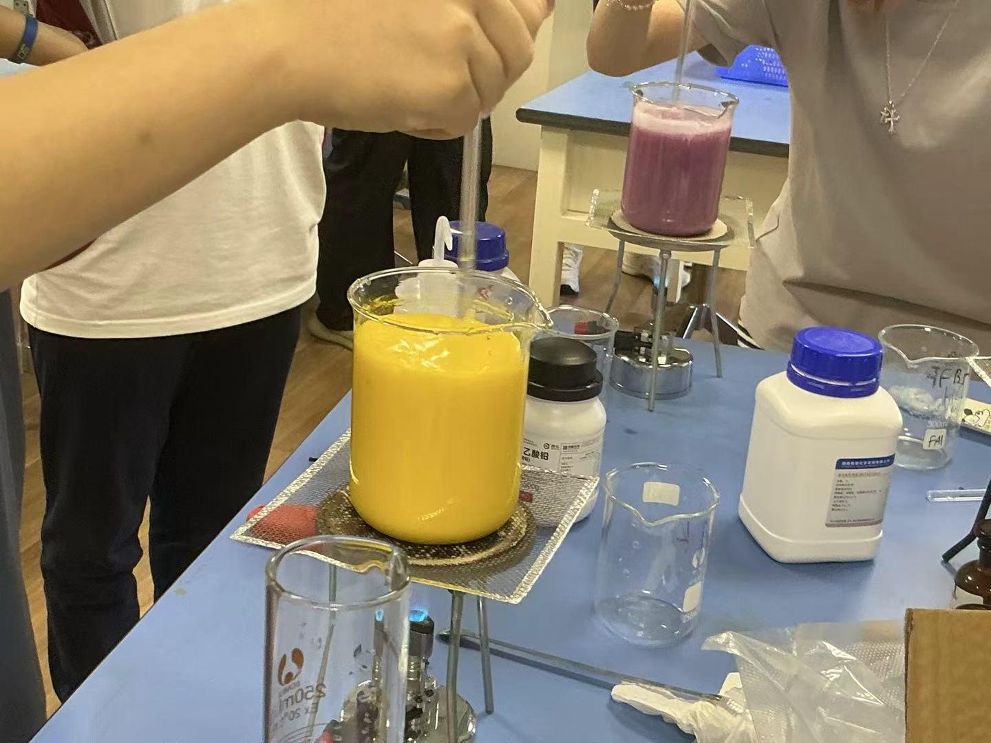 I remember most vividly that this semester, we finally replicated the "Three-Colour Crystal Rain" experiment I had long dreamed of—blue, pink, and yellow. A week before the experiment, we communicated with our instructor, Lisa, and purchased the relevant materials in advance. Our "core team" recorded and familiarised ourselves with the experimental procedures—members grouped by colour preference. We weighed, dissolved, heated, and mixed the substances, with three groups working simultaneously. Tiny crystals formed continuously, growing and sinking like magic—increasingly denser and denser. When the crystals fully formed, we added them to sample bottles, poured in water proportionally, and shook gently to reveal the stunning, deep-hued crystal rain. The warmth of a group of peers striving toward the same goal in the lab was unforgettable.